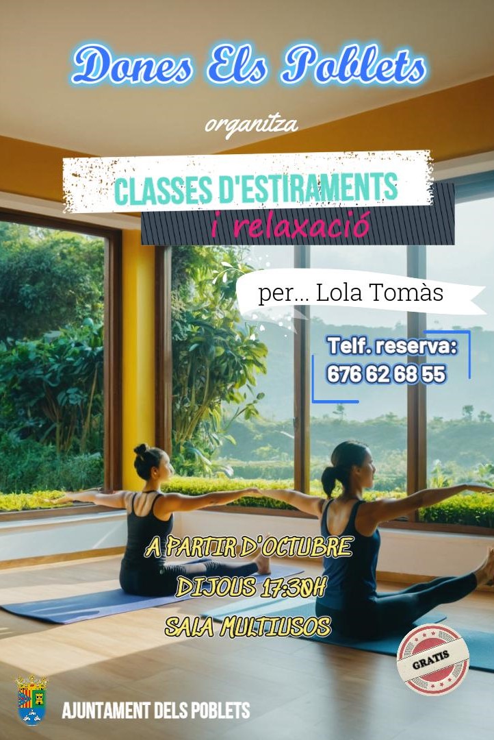 Dones Els Poblets organitza classes d’estiraments i relaxació amb Lola Tomàs. A partir d’octubre, tots els dijous a les 17:30 h a la Sala Multiusos. Activitat gratis. Reserva al 676 62 68 55.
