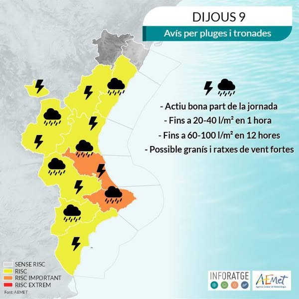 Degut a l’alerta meteorològica i a les previsions de pluges intenses i tempestes per al dijous 9 d’octubre, l’Ajuntament d’Els Poblets comunica la suspensió dels actes previstos.