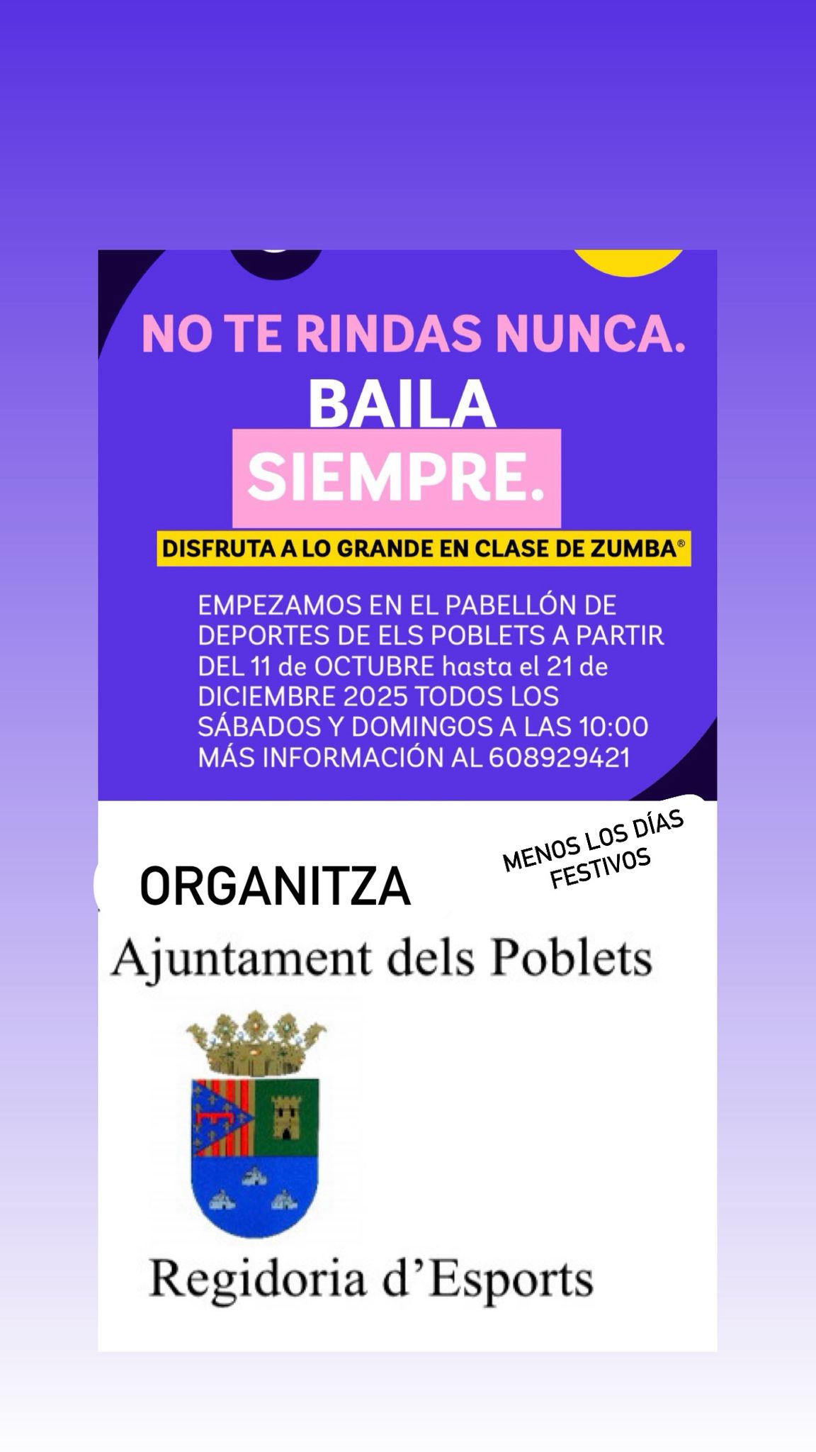 A partir de l’11 d’octubre, vine al pavelló d’esports dels Poblets i gaudeix de les classes de Zumba tots els dissabtes i diumenges a les 10 del matí (excepte festius).
