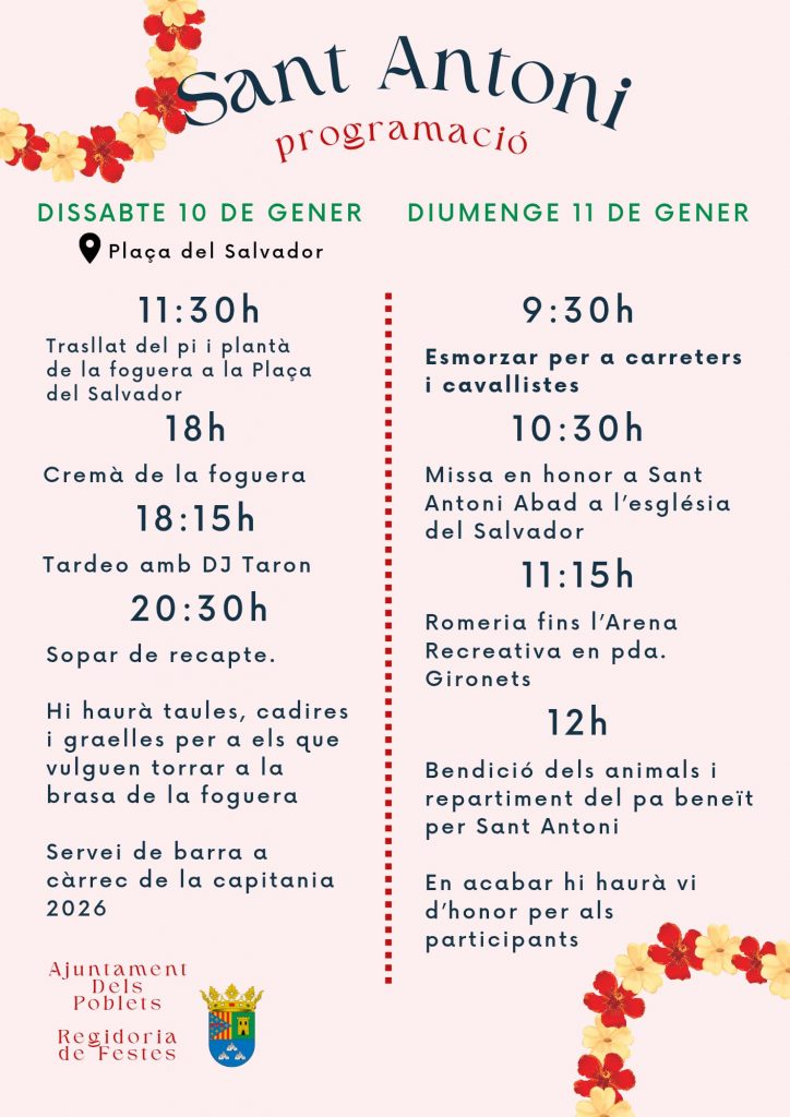 El poble celebra Sant Antoni 2026 els dies dissabte 10 i diumenge 11 de gener a la Plaça del Salvador. La festa començarà dissabte a les 11:30 h amb el trasllat del pi i la plantà de la foguera, i continuarà de vesprada amb la cremà a les 18:00 h i el “vespreig” amb DJ Taron a les 18:15 h. A les 20:30 h hi haurà sopar de recapte, amb taules, cadires i graelles per a qui vulga torrar, i servei de barra a càrrec de la Capitania 2026.