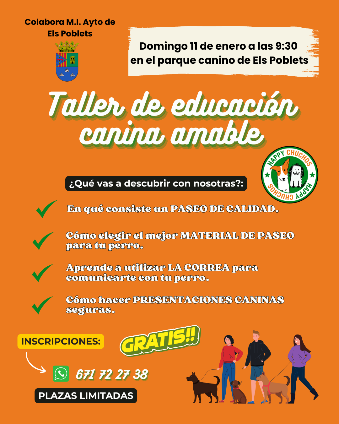 Diumenge 11 de gener a les 9:30, al parc caní d’Els Poblets, tindrà lloc el Taller d’educació canina amable. Parlarem de què és un passeig de qualitat, com triar el millor material de passeig, com utilitzar la corretja per comunicar-te amb el teu gos i com fer presentacions canines segures.