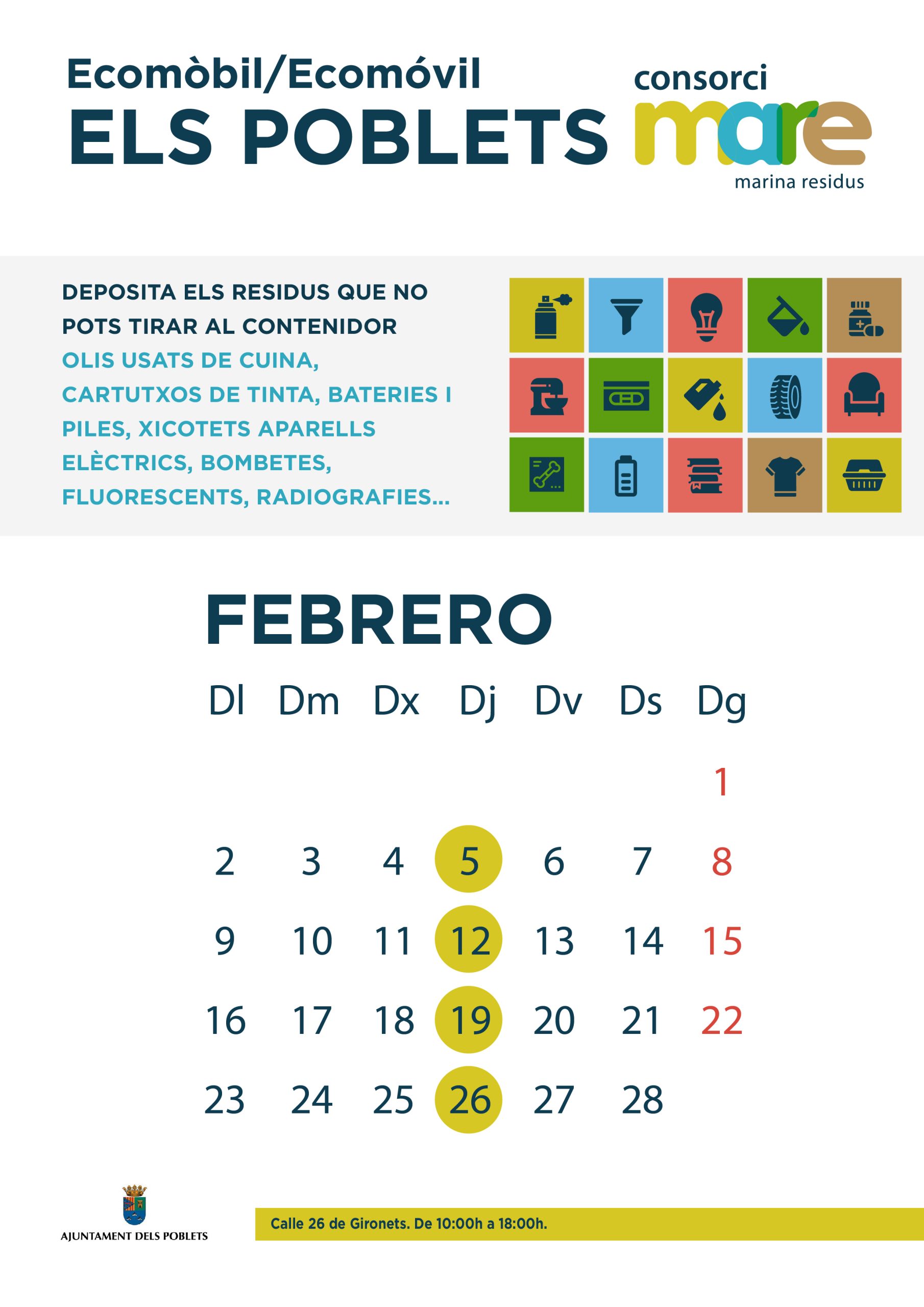 Al mes de febrer tens diverses dates per fer una gestió responsable dels residus especials. Porta’ls els dies assenyalats i contribueix a una recollida més sostenible, amb horari continu de matí i vesprada.